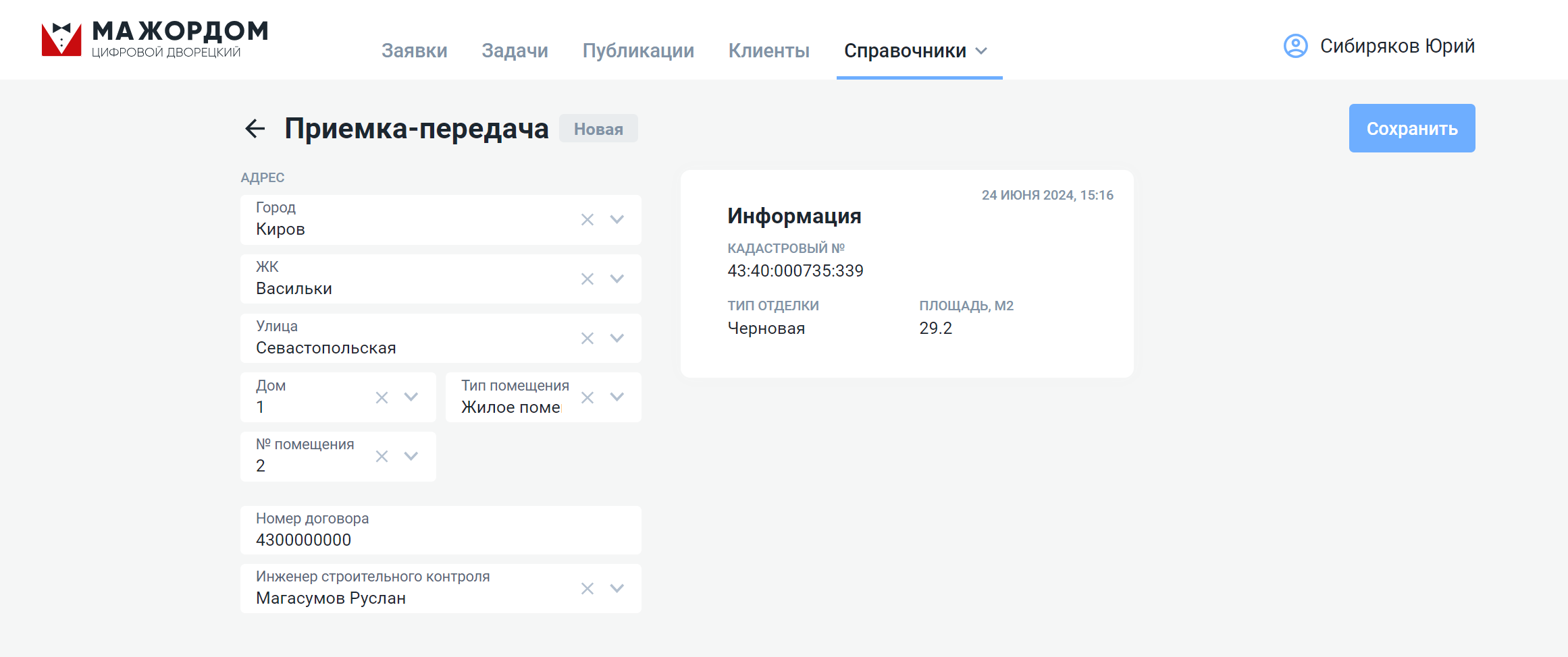 Важно: ЖК должен быть добавлен в систему перед созданием приемки-передачи!