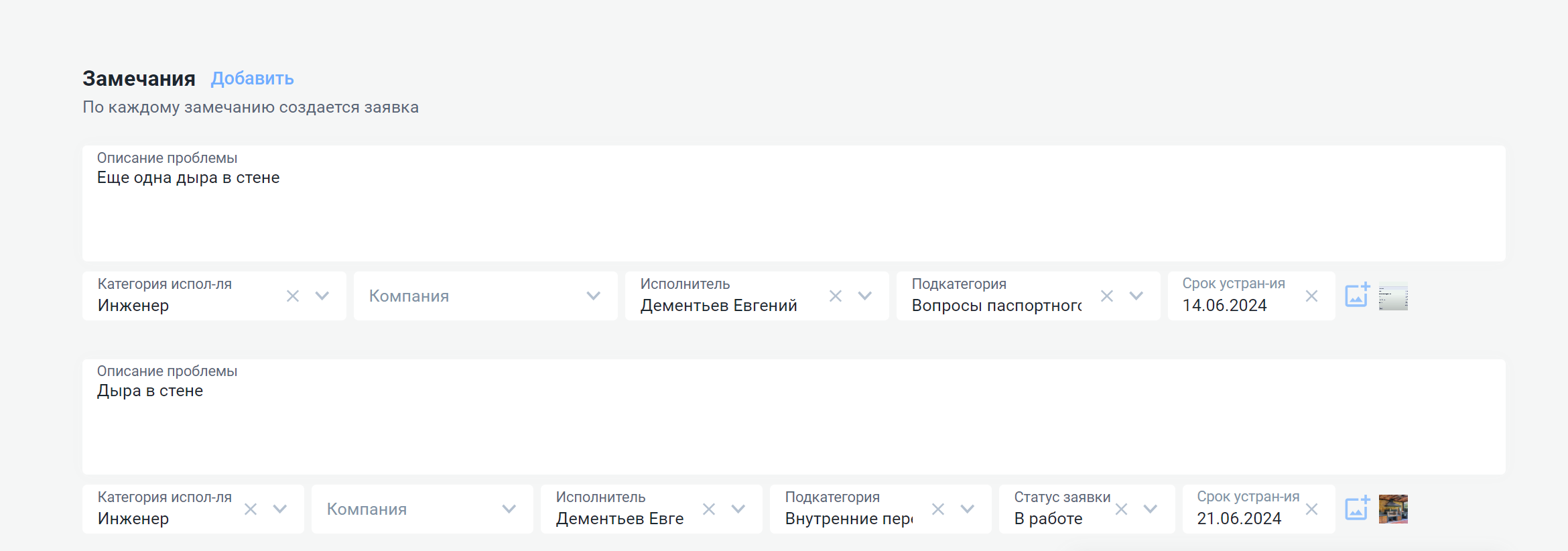 - Описание замечаний. Клиент может ввести произвольное количество текста, описывая любые проблемы или дефекты, т.к. поле поддерживает ввод большого объема текста, поэтому можно описать все проблемы одним списком.
