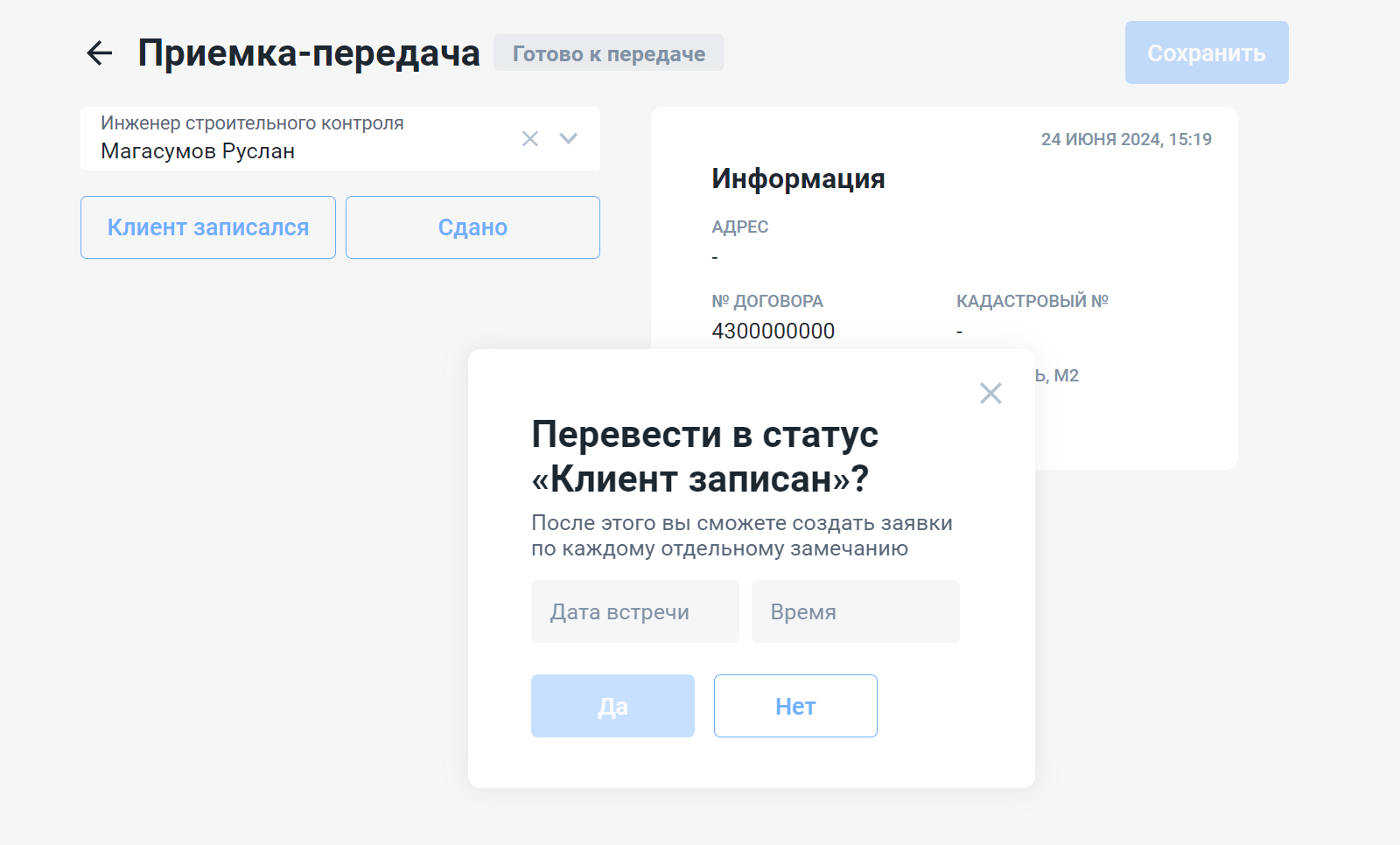 - Перевести в статус "Готово к передаче" - инициирует новую встречу с клиентом по вопросам приемки-передачи.