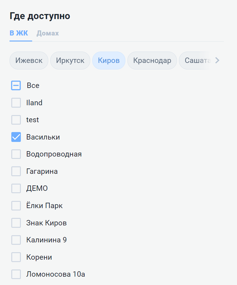 7. Где доступно. В данном разделе выбираются ЖК или Дома, жители которых смогут бронировать данный МОП