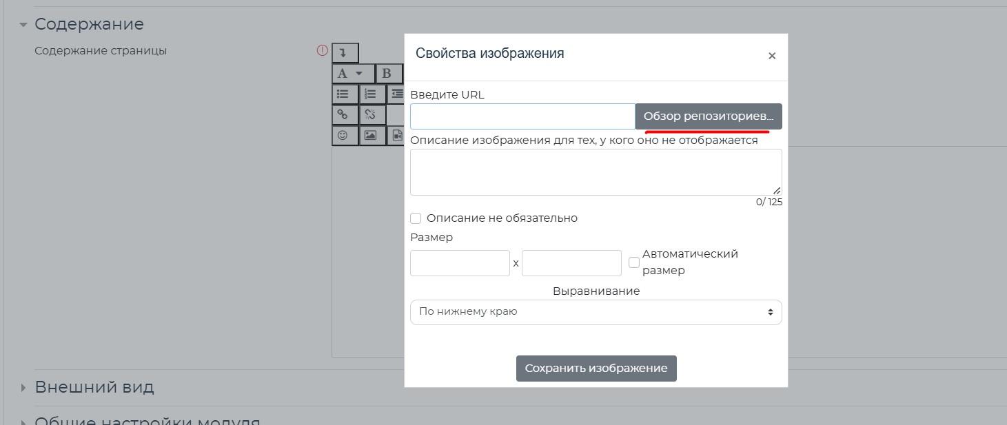 2. В содержании элемента добавляем необходимую информацию с помощью встроенного редактора, например "Изображение"