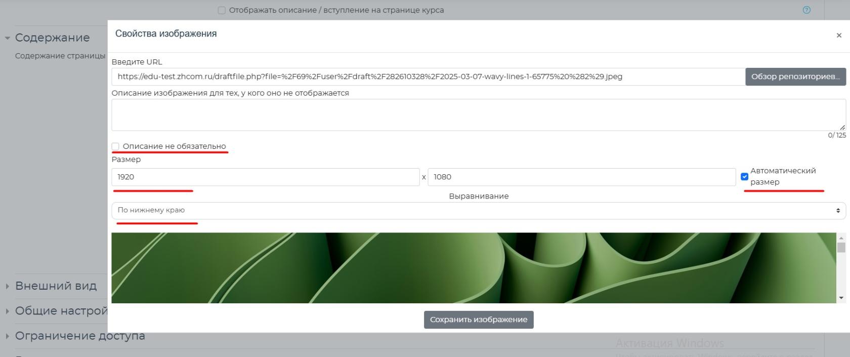 - Размер: Ширина и высота. Можем указывать одинаковую ширину для разных изображении и устанавливать галочку "Автоматический размер" так разные размеры изображения не будут сильно отличаться друг от друга на портале.