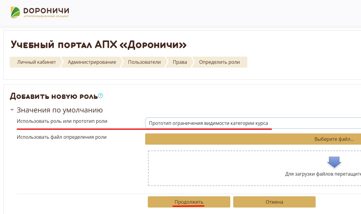 Использовать роль или прототип роли - Прототип ограничения видимости категории курса