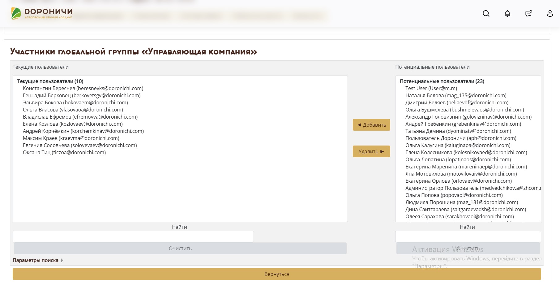 Администрирование/Пользователи/Права/Синхронизация ролей с глобальной группой